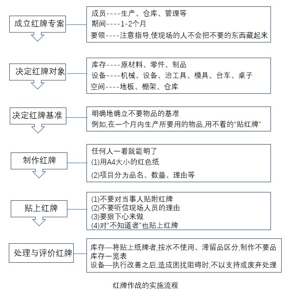 贴附的红牌移往红牌集中处后,应予以记录。将贴上纸牌者,按永不使用、滞留品区分,制作不要品库存一览表,对于设备-执行改善之后,造成困扰阻碍时,不以支持或废弃处理。红牌作战看板流程具体细节内容如上图所示。
